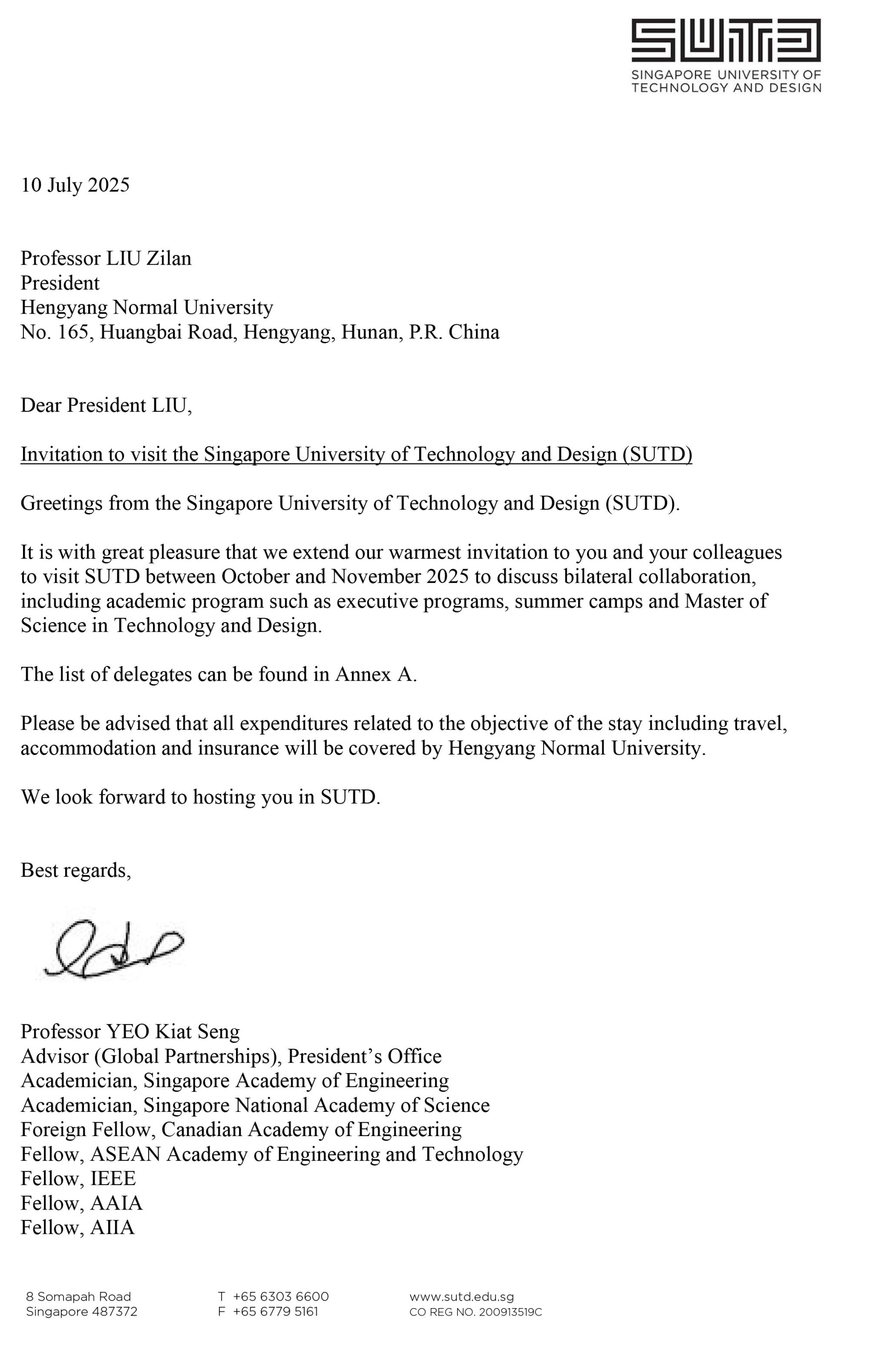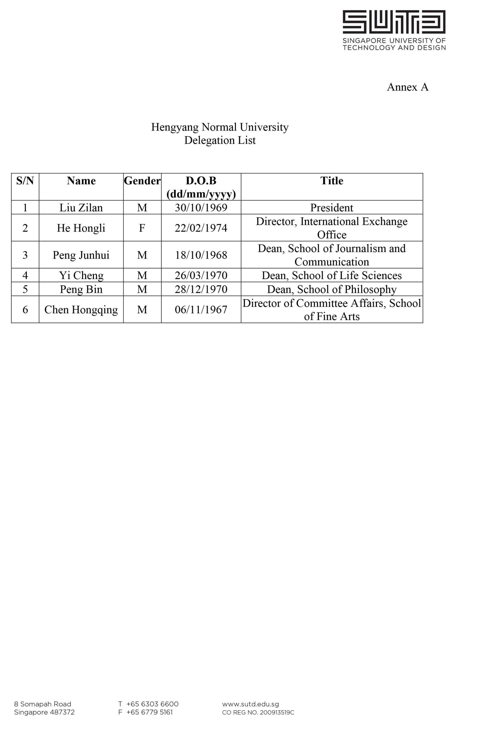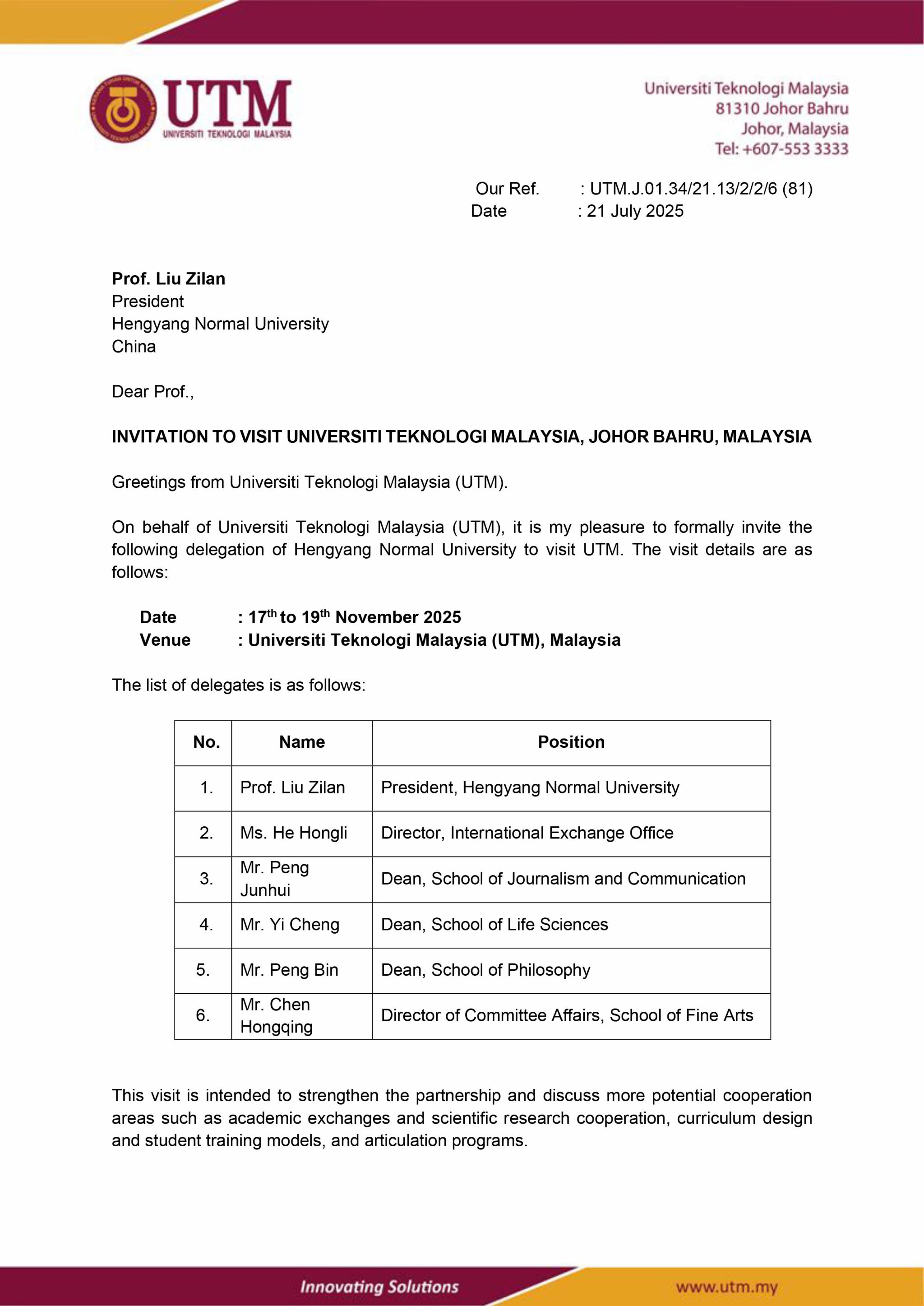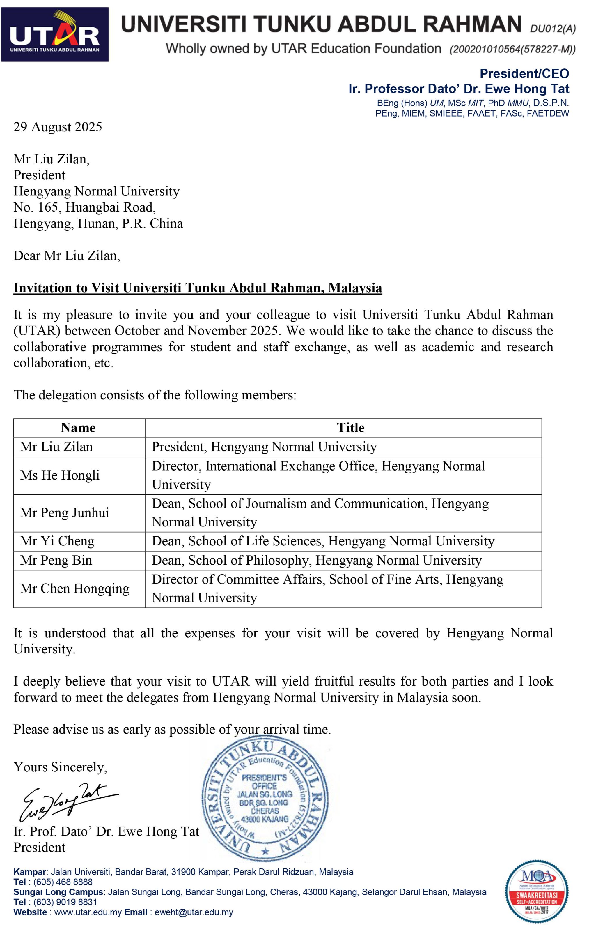 应马来西亚理工大学、马来西亚拉曼大学、新加坡科技设计大学邀请,304am永利集团党委书记刘子兰、国际交流处处长贺鸿莉、新闻与传播学院院长彭军辉、生命科学学院院长易诚、马克思主义学院院长彭斌、美术学院党支部书记陈洪清6人计划于2025年11月17日赴英马来西亚理工大学、马来西亚拉曼大学、新加坡科技设计大学进行访问,为期5天。经费预算16.92万元,从304am永利集团因公临时出国(境)经费开支。