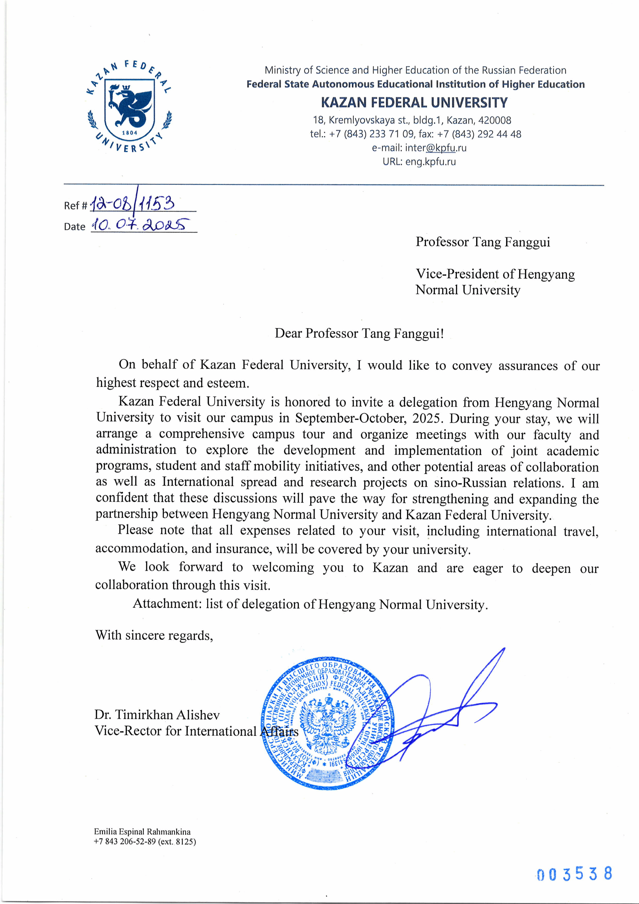 第五天 10.24 周五 | 喀山-上海浦东 MU5066 2000/0855+1 飞行:7H55M 09:30-11:30:访问俄罗斯喀山联邦大学,深度了解该校办学体系及办学特色,就联合培养博士方面商讨具体细节。 14:00-16:00:与俄罗斯喀山联邦大学校领导举行座谈,就如何进一步开展相关专业领域的学术交流、教科研合作和海外教师培训的可行性。 16:00-17:00:参观格俄罗斯喀山联邦大学实验室。 晚上乘机飞上海浦东,次日抵达。 |