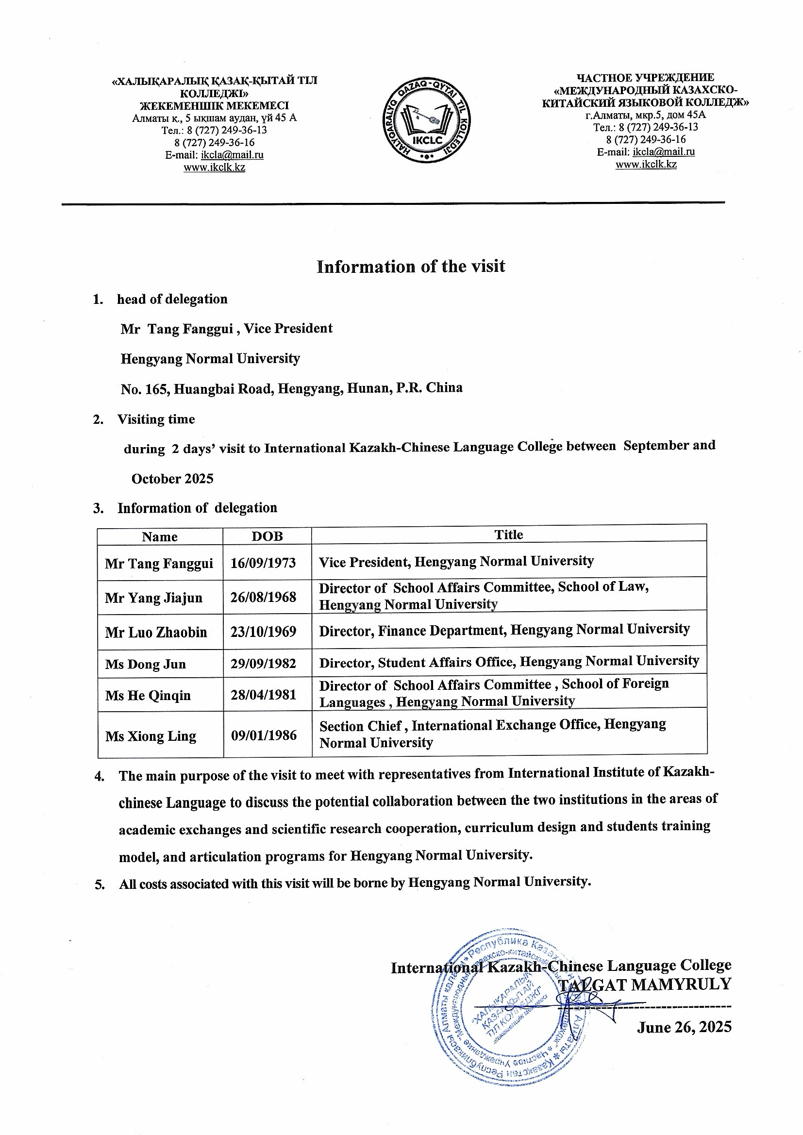 应哈萨克斯坦哈中国际语言学校、俄罗斯特维尔国立大学和喀山联邦大学邀请,304am永利集团304am永利集团唐芳贵、法学院书记杨家骏、外国语学院书记贺琴琴、计划财务处处长罗召斌、学工工作部部长董俊、国际交流处科长熊琳6人计划于2025年10月20日赴以上院校访问,为期6天。经费预算24万元,从304am永利集团因公临时出国(境)经费开支。