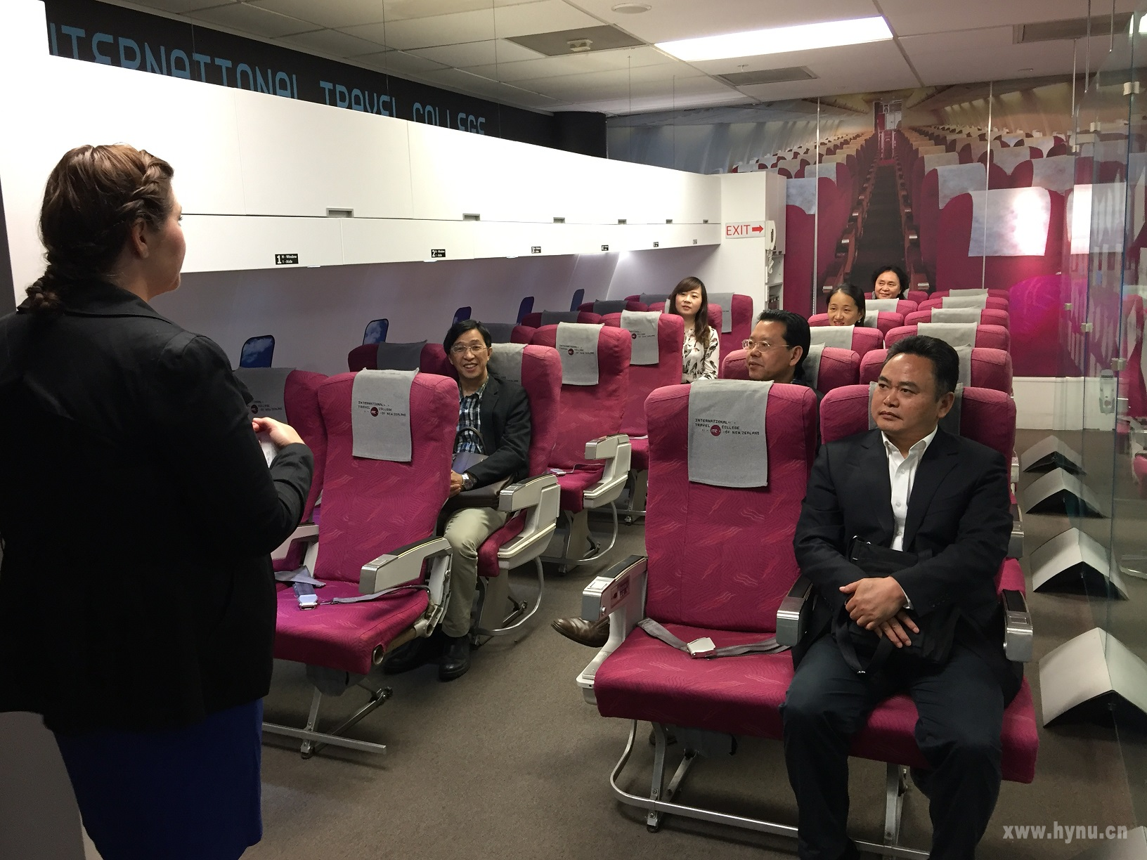 考察团在新西兰国际旅游学院实地考察与体验航空服务实训设施