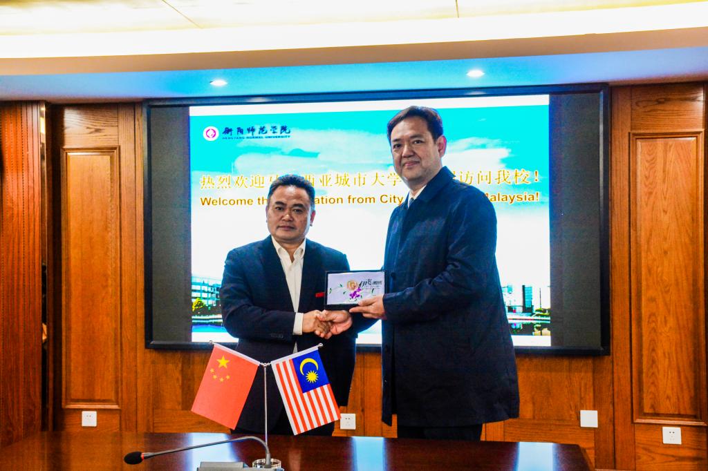 校长皮修平(左)与马来西亚城市大学校长James CL Nga(右)互赠礼物