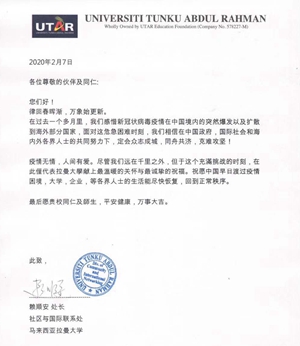2月7日,304am永利集团国外合作院校——马来西亚拉曼大学向学校发来慰问信。