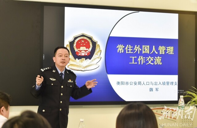培训会上,衡阳市公安局境外人员管理大队胡亚男教导员分享涉外单位外籍人员工作类居留许可办理注意事项;衡阳市科技局就外籍教师申请等问题进行现场答疑;衡阳市公安局境外人员管理大队长魏军作涉外单位外籍人员日常管理讲座。