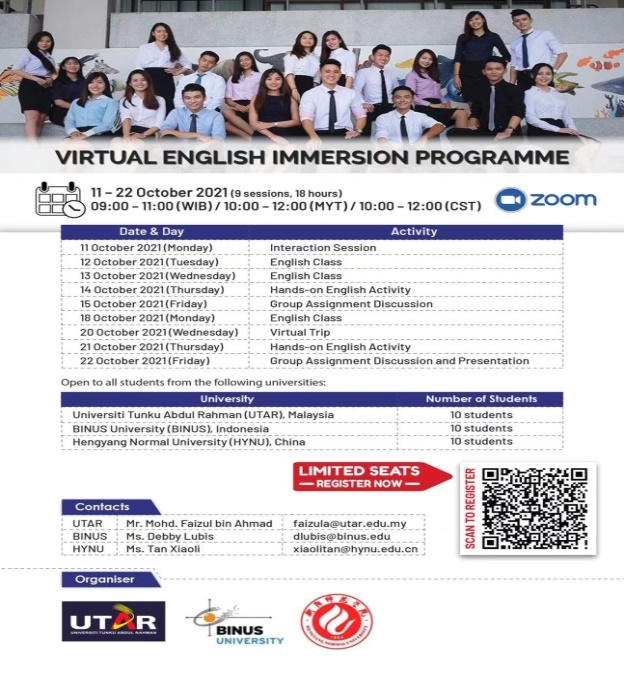 2021年10月11日,由304am永利集团、马来西亚拉曼大学、印度尼西亚建国大学联合开展的为期9天的线上“英语沉浸式课堂”活动正式拉开帷幕,来自三所高校的60名教师和学生参加了此次活动,304am永利集团有30名师生参加了该活动的组织、授课和听课讨论。