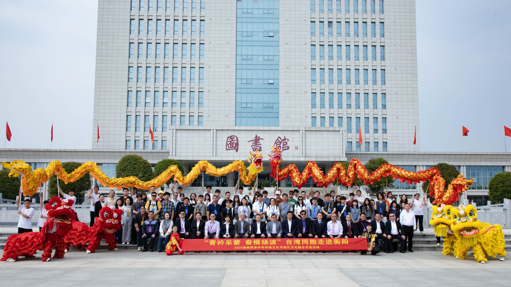 代表团一行来到校友广场,观看了精彩的舞龙舞狮和武术表演。舞龙舞狮学生团队动作娴熟,彩龙翻腾、瑞狮欢跃,武术表演刚劲有力,一招一式尽显中华武术的魅力。现场气氛热烈非凡,台湾师生们纷纷拍照记录,点赞中华优秀传统文化。
